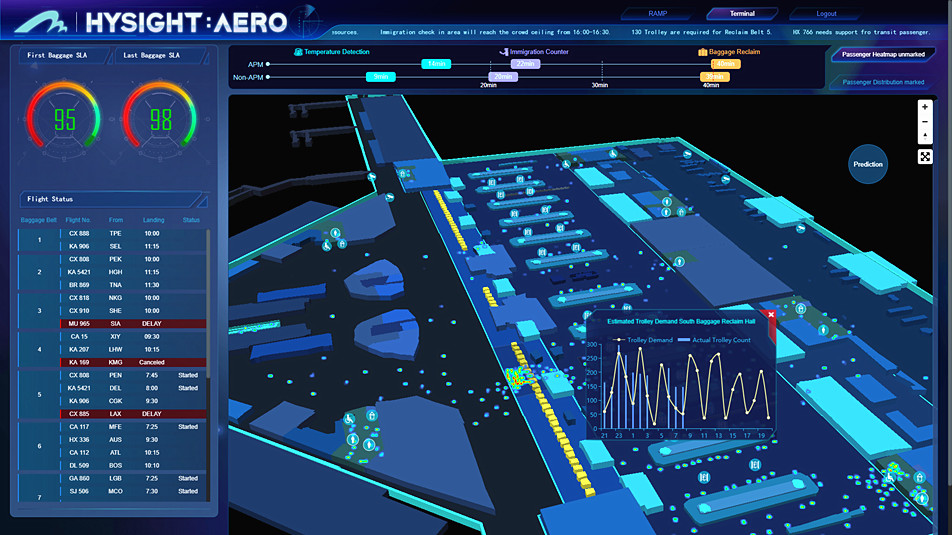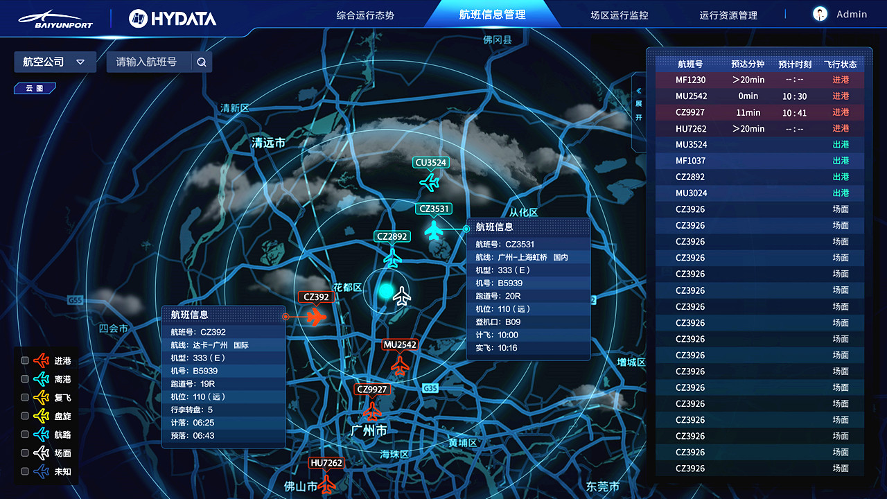 廣州白云機場的可視化智能指揮決策系統,對機場內“三大區”(即飛行區、航站區、綜合區)的各項業務數據進行整合,集合空管、氣象、交通、地圖、運營商等數據,結合大數據可視分析技術與人工智能技術,實現了對 “五大流”(即飛機流、旅客流、行李流、貨物流、交通流)全區域覆蓋、全流程管控,每分鐘可處理6萬條信息。通過分析出機場當前的綜合運行態勢、各場區運行動態,對機場整體態勢進行實時可視化展現,實現通過“一張屏”了解機場整體運行狀況和進行各種調度。