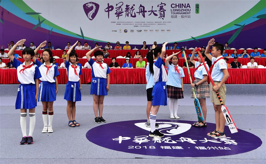 臺海網 6月17日,小學生代表在開賽儀式上。當日,2018年中華龍舟大賽(福建·福州站)在福州海峽國際會展中心浦下河龍舟池開賽。 新華社記者魏培全攝