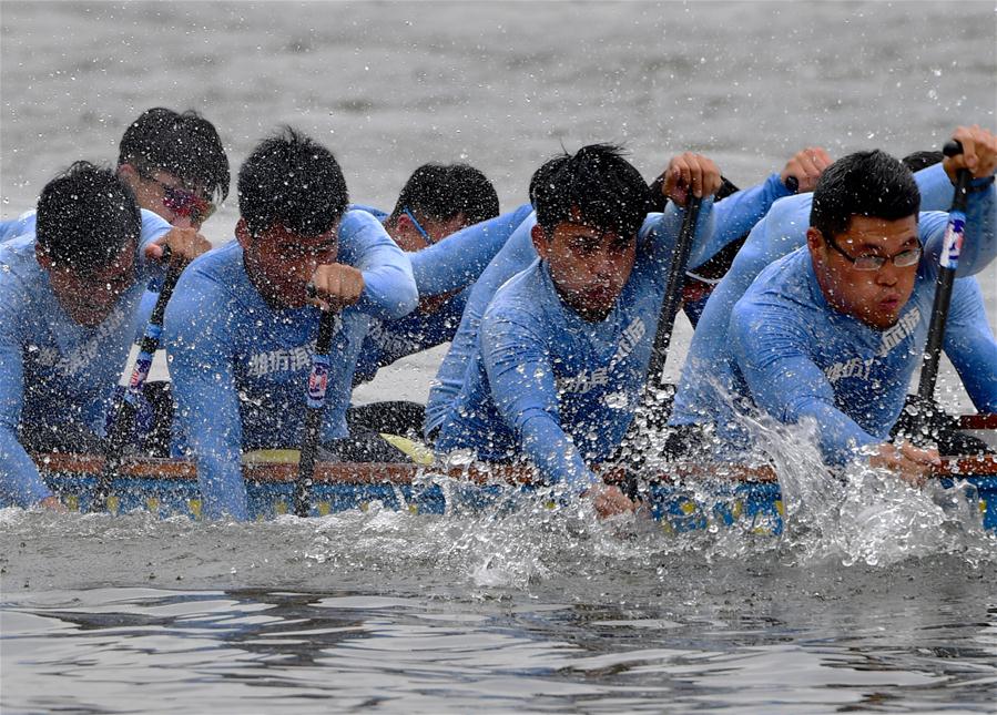 6月17日,聊城大學龍舟隊在公開混合100米直道賽晉級賽中。 新華社記者魏培全攝