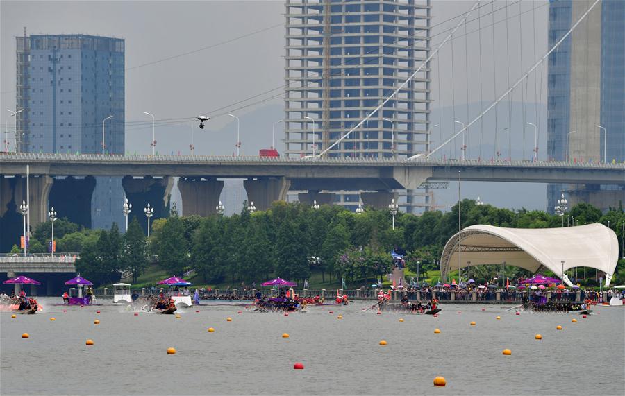 6月17日,高新區建平根雕龍舟隊(前)在傳統龍舟預賽中。新華社記者魏培全攝