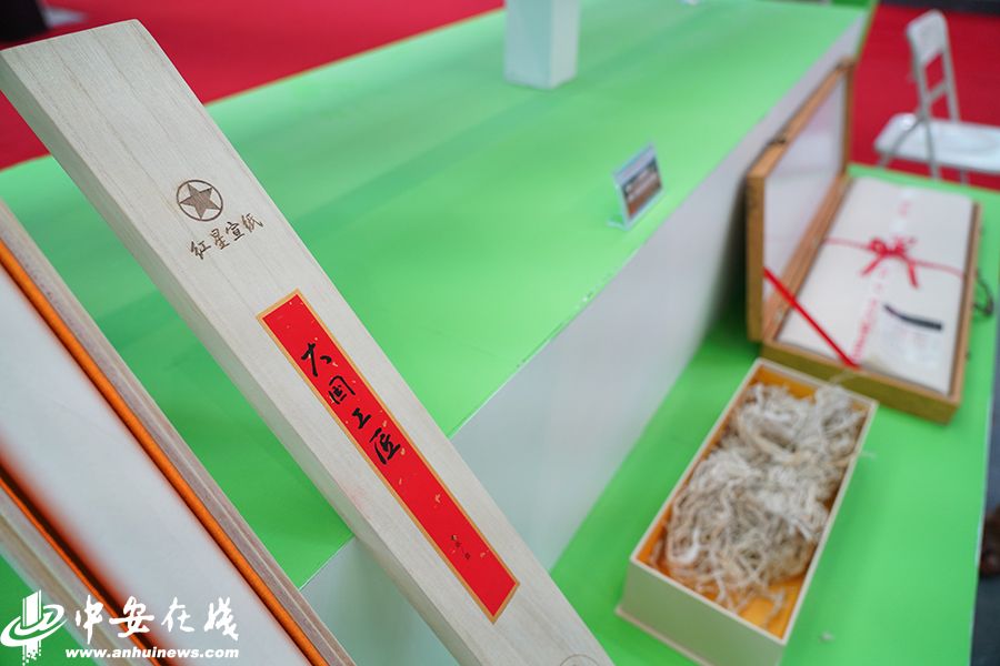 中國(guó)傳統(tǒng)的文房四寶中,宣紙產(chǎn)自于安徽宣城。在位于主展館中部的宣城市展區(qū)內(nèi),一排排擺放整齊的宣紙和制作精良的紙扇吸引了眾多參會(huì)人員的注目。據(jù)工作人員介紹,如今的宣紙是由當(dāng)?shù)氐那嗵礃淦ず蜕惩辽a(chǎn)的水稻秸稈一起加工制成,市面上售賣的多為用于書法創(chuàng)作的“面料”宣紙,每一張“面料”宣紙中就含80%的秸稈成分。