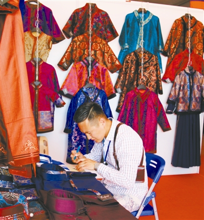 上午9點(diǎn)左右,開(kāi)始有顧客三三兩兩走入展廳。記者注意到,由于語(yǔ)言上的優(yōu)勢(shì),無(wú)論是蒙古國(guó)的服裝、鞋帽、飾品,還是書(shū)畫(huà)作品的展位前,總不乏說(shuō)蒙語(yǔ)的顧客光顧。
