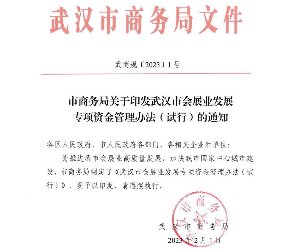 近日,《武漢市會展業發展專項資金管理辦法(試行)》出臺。《辦法》共制定7章共20條政策措施,進一步支持武漢國際消費中心城市和國家會展名城建設。