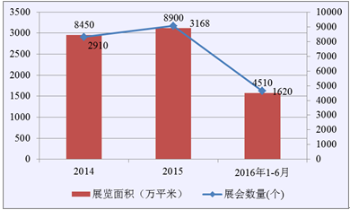 調研數據顯示,2014年,全國共舉辦了各類展覽2910場,同比增長9.4%;展覽面積8450萬平方米,同比增長4.3%,展覽項目增長快于展會面積增長,展覽效益向好。從2014至2016年上半年無論展覽數量還是展覽面積,都保持了穩定增長的步伐。