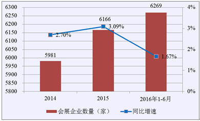 隨著會展行業快速發展,我國從事會展服務行業的企業數量穩步增長,從2014年的5981家增長到了2016年的6269家,越來越多的中小企業成長起來,在各地會展行業形成了自己的品牌。