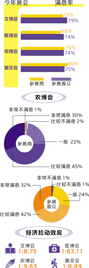 從結果來看,4個展會的總體滿意度良好,滿意率普遍在70%以上。其中,文博會參展商滿意率73%,參展觀眾的滿意率為79%;醫博會參展商滿意率為68%,參展觀眾滿意率為74%;農博會參展商滿意率為75%,參展觀眾滿意率為74%;旅交會參展商滿意率為80%,參展觀眾滿意率為75%。