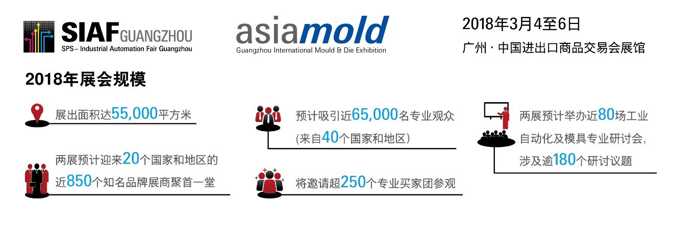 第十二屆廣州國(guó)際模具展覽會(huì)(Asiamold)將于2018年3月4-6日在廣州進(jìn)出口商品交易會(huì)展館隆重舉行,本屆展會(huì)將再次與SIAF廣州國(guó)際工業(yè)自動(dòng)化技術(shù)及裝備展覽會(huì)同期舉行,總專(zhuān)業(yè)觀眾人數(shù)達(dá)到65,000 名,吸引共850家展商,展覽面積占55,000平方米。