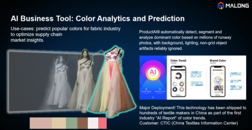 在此次展會上,碼隆科技推出的人工智能色彩趨勢大數據分析平臺亮相。該平臺可深度挖掘海量品牌服飾色彩信息,準確抓取圖片中如風格、款式等服飾屬性,并將色彩信息與人工智能大數據相結合,用客觀的數據分析和AI算法將顏色等元素系統化地呈現出來,充分解析秀場上的流行趨勢,助力時尚企業客戶把握時尚先機,快速洞悉時尚,準確把握時尚市場方向。