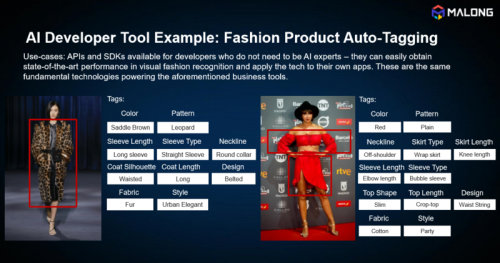 此外,碼隆科技還展示了其核心產品?。校颍铮洌酰悖簦粒伞∪斯ぶ悄苌唐纷R別平臺在時尚領域的解決方案。客戶平臺僅需通過調用服飾識別?。粒校?,即可輕松快快捷地對商品圖片進行服飾屬性識別和多種類標簽分類,標簽維度涵蓋品類、工藝、廓形、面料、紋樣。僅以服裝廓形為例,該解決方案可以識別具體的版型、衣長、袖型、領型等,為時尚企業帶來全新的服飾數據結構化體驗。