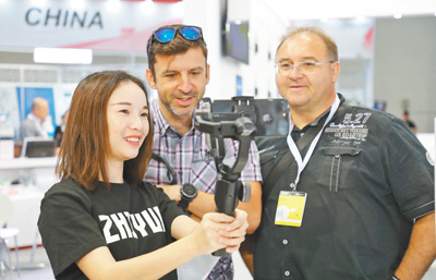 在中國(guó)展區(qū),一名工作人員正在向觀眾展示一款手機(jī)穩(wěn)定器。