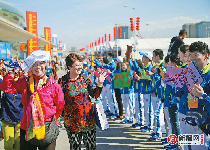 2016年9月25日,第五屆中國—亞歐博覽會圓滿落幕。展會的志愿者們舉著“大美新疆歡迎您”“后會有期”“中國—亞歐博覽會歡迎您再來”等祝福語,在新疆國際會展中心西門列隊歡送參展商和觀眾。(本網資料圖片)