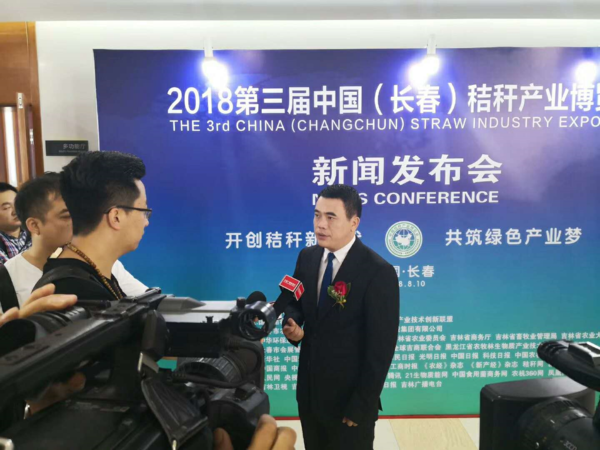 圖為2018第三屆中國(長春)秸稈產業博覽會組委會主席彭飛接受媒體采訪