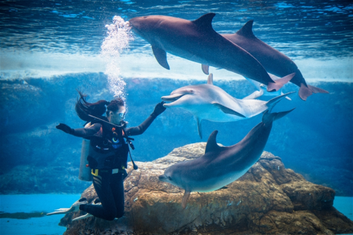 PADI大中華區第一位女性自由潛水教練官黎達在珠海長隆海洋王國與海豚一起潛水