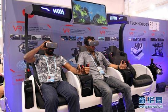 兩位采購商在第124屆廣交會上體驗VR游戲。 新華社記者 梁旭 攝