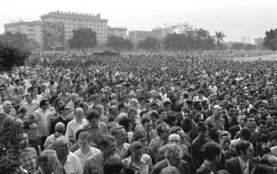 1973年春交會,展館外等待入場的境外采購商們。新華社資料照片
