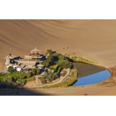 鳴沙山月牙泉風景名勝區,主要景點有月牙泉、鳴沙山。月牙泉處于鳴沙山環抱之中,其形酷似一彎新月而得名。鳴沙山位距敦煌市南郊5公里,因沙動成響而得名。鳴沙山為流沙積成,分紅、黃、綠、白、黑五色。